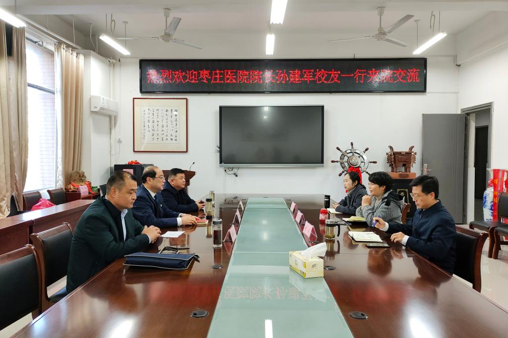 为凝聚校友力量,促进资源的共享与互通,开拓学院毕业生就业渠道,11月29日上午,枣庄医院院长孙建军等一行3人来医学院交流工作。交流座谈会在崇仁楼C114会议室召开。学院党委书记张可佳、院长胡东参加了会议。