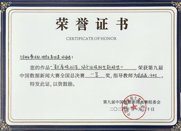 栾晶晶、方胜老师指导,2022级网媒专业徐畅团队《“数”看碳标签,绿色低碳转型新趋势》获得国赛一等奖;王偲老师指导,2022级网媒专业郝方瑜团队《从“因陵建校”到“强军摇篮”——野寨中学有何特别之处》获得“最具传播力”单项奖。