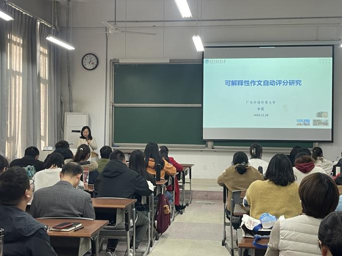 11月29日下午,应外国语学院邀请,广东外语外贸大学博士生导师李霞教授在明理北103为学院师生带来“可解释性作文自动评分研究——兼谈外国语言文学师生计算思维培养和国家级基金申报”的学术讲座,外国语学院师生共计100余人参加,讲座由外国语学院副院长周宁主持。