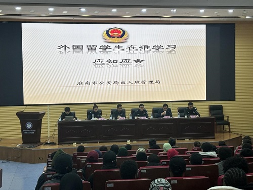 淮南市公安局出入境管理局局长梁育荣警官围绕“外国留学生在淮学习应知应会”这一主题,详细讲解了外国人签证和居留许可的法律法规,从出入境管理、生活中的法律注意事项以及涉外案件处理的基本原则等方面,结合典型案例着重强调留学生要做到遵纪守法,不非法入境、不非法就业、不非法居留。