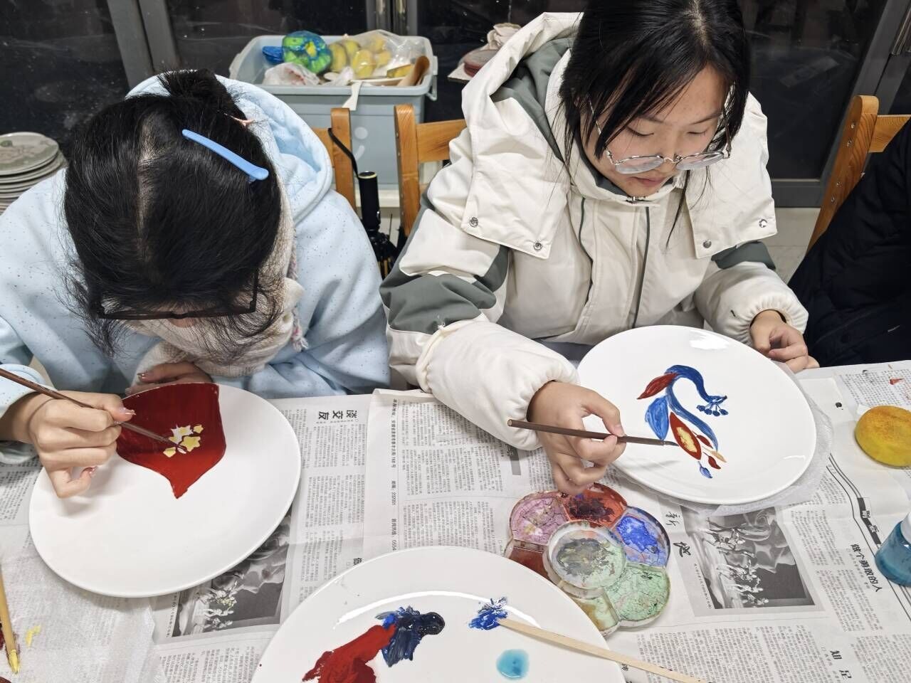 实践互动,激发创意潜能。在动手实践过程中,王静与同学们进行互动交流,解答他们在创作过程中遇到的困惑和问题,鼓励同学们要敢于尝试、勇于创新,将个人情感融入作品之中,让每一件作品都成为心灵的写照和情感的寄托。同学们纷纷拿起画笔,以陶瓷盘为画布,尽情挥洒创意,从最初的生疏到后来的游刃有余,每一笔都凝聚着对艺术的热爱与追求,绘出一幅幅充满创意与个性的作品。现场洋溢着浓厚的艺术氛围,同学们的脸上流露出沉浸创作、享受艺术的喜悦。