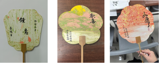 漆扇制作同样精彩纷呈,同学们利用各种颜色的搭配,染出一幅幅充满鲜艳色彩的艺术作品,充分展现出了同学们对生活美学的热爱与追求。