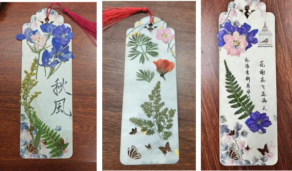 书签制作区域,同学们发挥创意,将书法、干花与书签制作巧妙融合。素净的书签在他们的精心设计下,变成了一件件精美的艺术品,有的贴上淡雅的花卉,有的题上励志的诗词短句,为阅读时光增添了一抹艺术色彩。