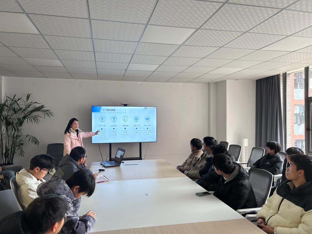此外,活动还设置了模拟面试环节。学生们分组进行模拟面试,互相扮演面试官和求职者的角色,蒋倩倩对学生们的表现进行现场点评和指导。这一环节让学生们亲身体验了面试的氛围和流程,也让他们更加清晰地认识到了自己在面试中的不足之处。通过耐心指导,学生们纷纷表示受益匪浅,对自己的面试能力有了更大的信心。