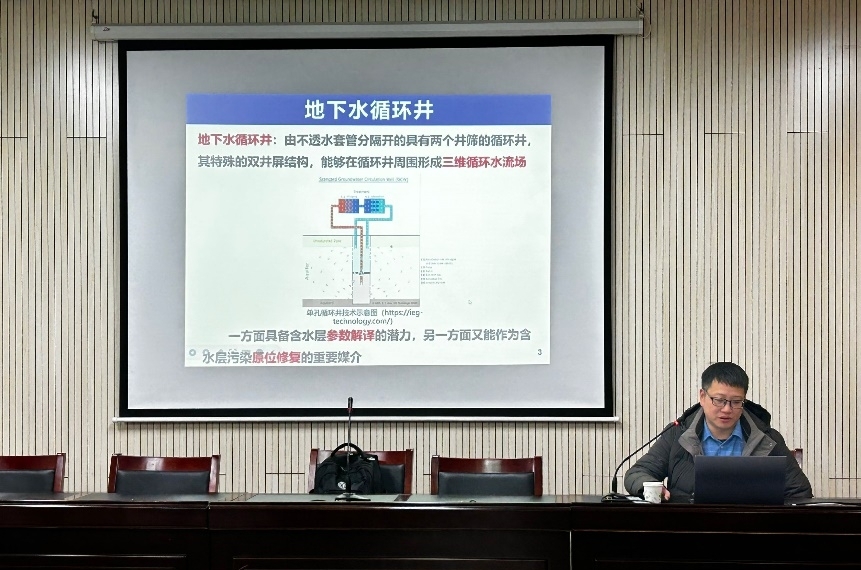 12月20日上午,中国地质大学(武汉)生物地质与环境地质国家重点实验室常务副主任袁松虎教授应邀来地球与环境学院指导国家自然科学基金申报工作并作题为“国家自然科学基金申报体会”的讲座,中国地质大学(武汉)文章教授应邀作题为“含水层污染原位修复中的地下水循环井模型及应用”的学术报告,详细介绍了其团队在地下水循环井模型开发及修复应用方面的最新进展。讲座由学院副院长张世文教授主持。学院青年教师及研究生参加了本次活动。