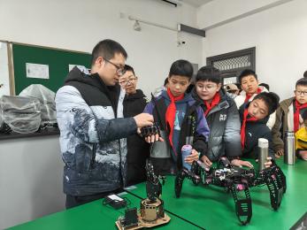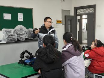 为了让小同学们在轻松愉快的氛围中掌握技能和知识,确保科普教育内容既有趣又能引导同学们思考,人工智能学院实验中心的老师们做了精心准备。活动伊始,实验中心副主任丁云霞和胡锐、黄建超、李康康等老师为来访师生,分项目细致讲解了移动机器人、六足蜘蛛机器人、履带式搬运机器人、感应机械手装置等仪器设备及其原理并进行了操作演示,同时针对同学们提出的问题现场答疑解惑。