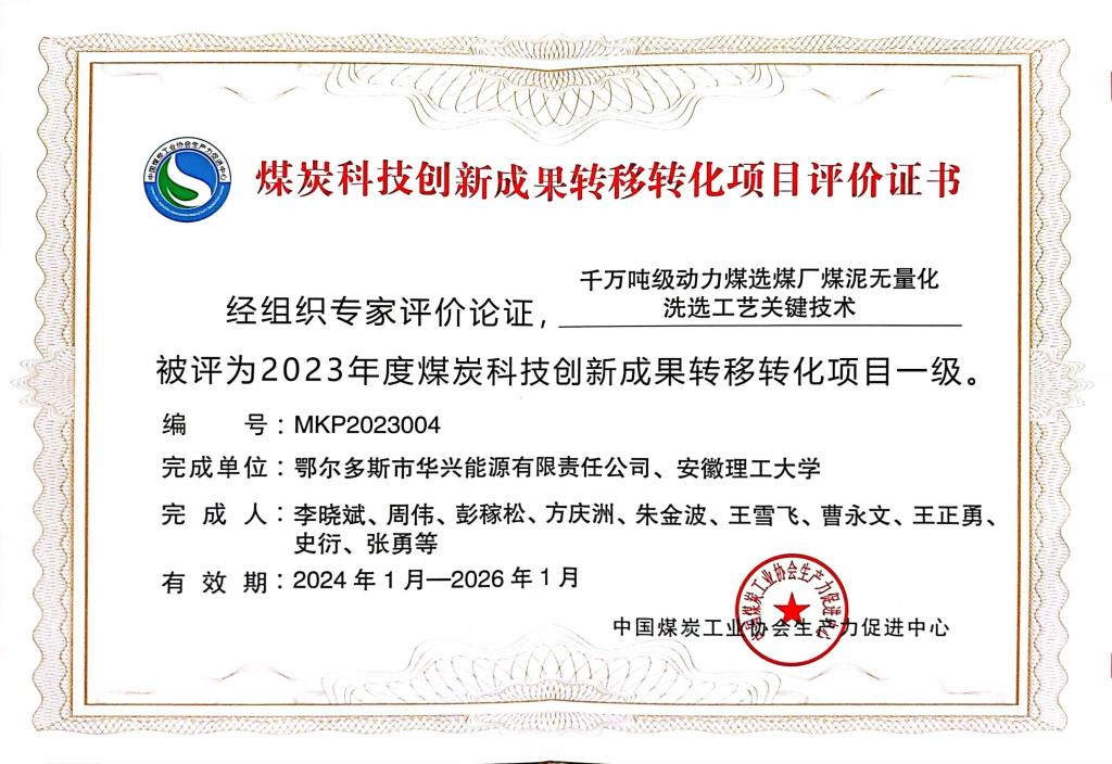 目前已有“千万吨级动力煤选煤厂煤泥无量化洗选工艺关键技术”“基于产品效益最大化的动力煤多粒级协调分选调控技术”和“动力煤多粒级高效分选联动机制”三项项目通过煤炭工业协会组织的专家鉴定,其中1项为国际领先水平,2项为国际先进水平。煤泥无量化洗选工艺关键技术成果于2023年列入煤炭科技创新成果转移转化一级项目,在选煤行业掀起一股煤泥无量化学习热潮,《中国煤炭报》、腾讯网均发布相关新闻报道,为煤炭行业的环保与经济效益提升开辟了新的路径。