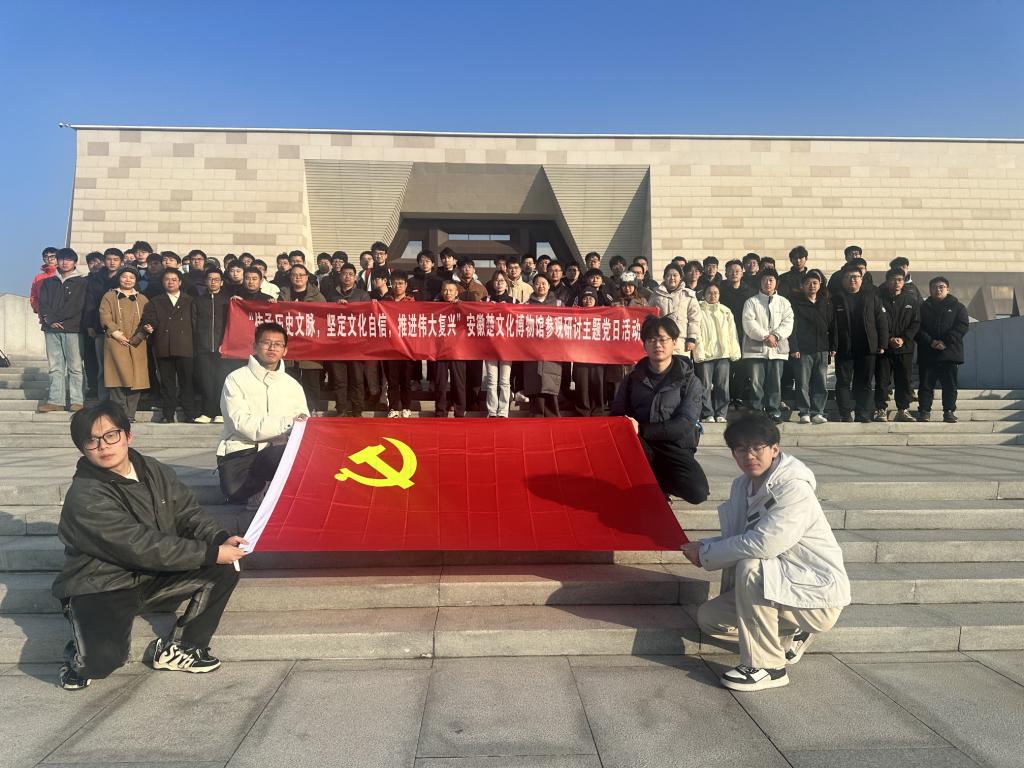 在楚文化博物馆,学院各党支部联合开展了“传承历史文脉,坚定文化自信,推进伟大复兴”主题党日活动。在讲解员引导下,师生党员依次参观了楚文化陈列和寿县文明史陈列,各类历史文物、遗迹尽显匠心与历史底蕴。在“革命沃土”陈列单元,师生党员集体过“政治生日”,满满的仪式感不仅是对党员身份的一种提醒和激励,也彰显了学院党委对师生党员的关心与重托。活动中,师生党员们还集体重温了入党誓词,并就习近平总书记发表的二〇二五年新年贺词展开热烈讨论。