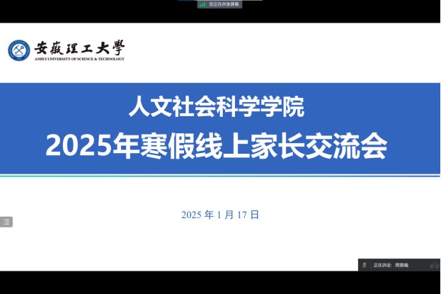 1月17日晚,人文学院召开2025年寒假线上家长交流会。学院党政领导班子、本科生辅导员以及近300位家长参加了会议。家长会由周雪晴主持。