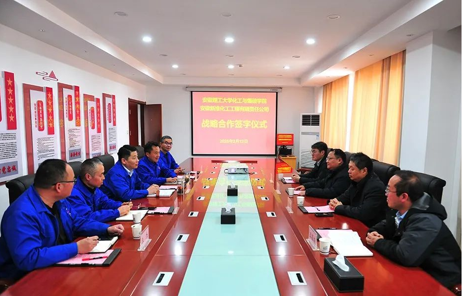 为促进校企产学研深度融合,2月12日,化工与爆破学院党委副书记、院长汪泉等一行4人赴安徽新淮化工工程有限责任公司签订校企合作协议。安徽新淮化工工程有限责任公司党委书记胡滨,党委副书记、总经理万家思等相关部门负责人出席签约仪式。