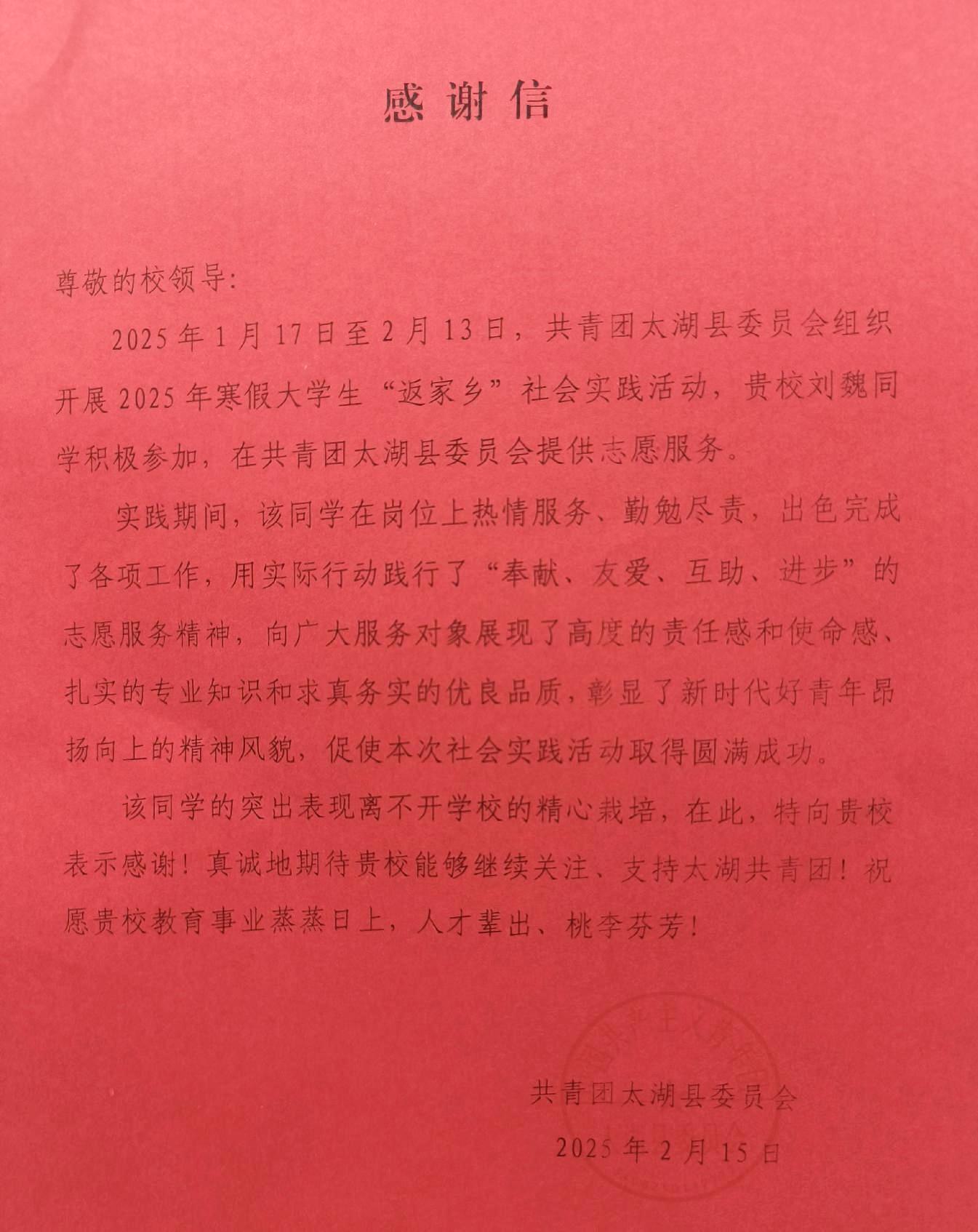 学期伊始,学院收到了一封来自共青团太湖县委员会的感谢信,信中高度赞扬了学院水文与水资源工程2024-1班刘魏同学在寒假期间积极参与太湖县委员会组织和开展的大学生“返家乡”志愿服务活动中的突出表现。她用实际行动诠释了当代大学生的责任与担当,展现了安徽理工大学地球与环境学院学子的优秀品格。在志愿服务期间,刘魏同学始终以饱满的热情和高度的责任感投入工作。无论是社区服务、环境保护,还是关爱弱势群体,她都尽心尽力,用实际行动传递温暖与正能量。她的无私奉献和踏实肯干的精神,赢得了当地群众的一致好评。