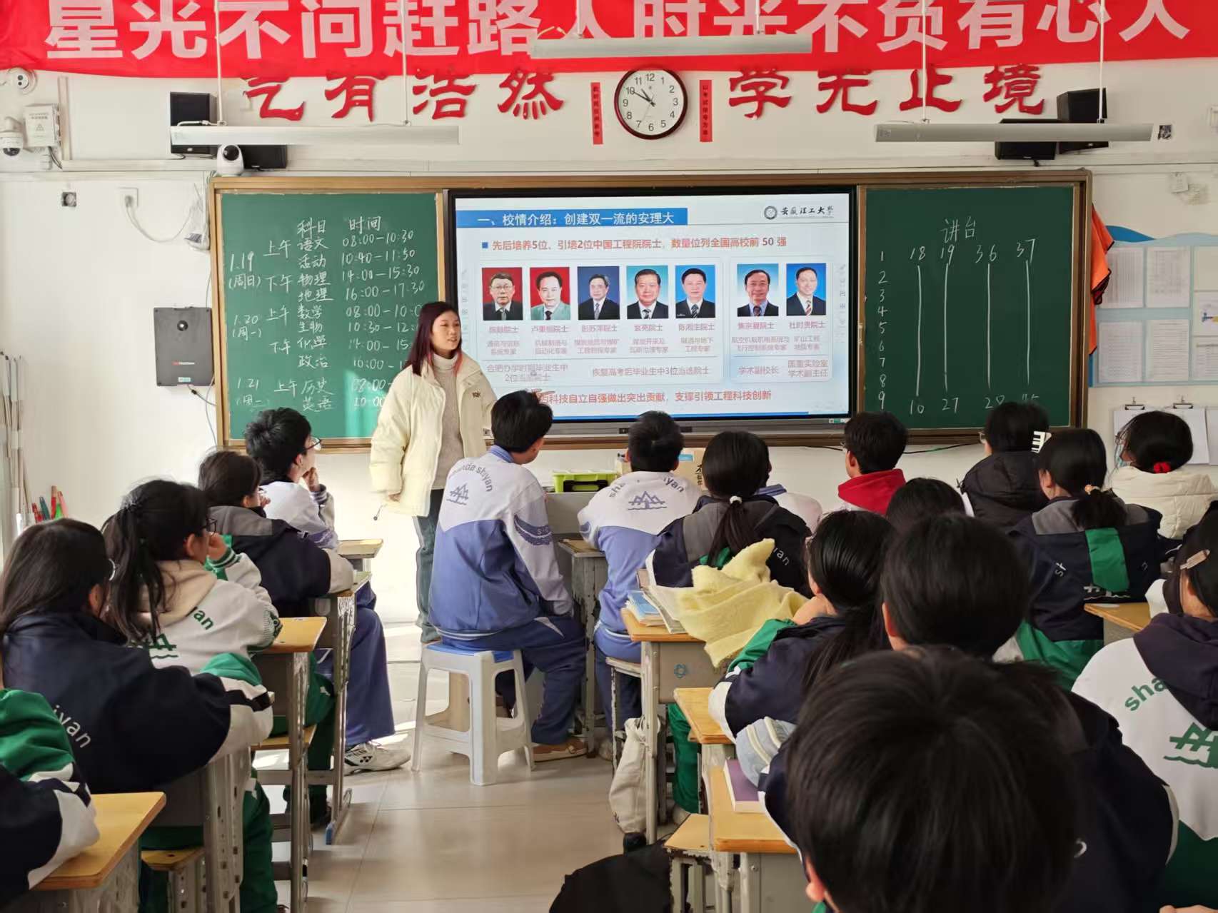 学院动员弹药24-2班昝赟、弹药24-8班金野、制药24-1班王如凡等10余名同学,利用寒假回访高中母校,开展招生宣传活动。宣讲过程中,同学们向高中的学弟学妹们详细地介绍学校发展、专业特色、校园文化等,分享了自己大学的生活经验和学习心得,鼓励学弟学妹们努力学习,勇敢追梦,极大地提升了学校在高中学子心目中的影响力和美誉度。昝赟说:“作为一名大一学生,很高兴这次能以校友的身份重回高中母校为我的大学进行宣传,为此我做了vlog宣传片给大家展示校园风采,安理的校园很美,希望能吸引更多的学弟学妹们能选择安理,我们一起在安理筑梦、启航。”