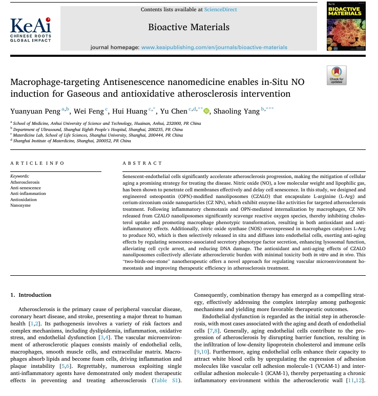 医学院2022级影像医学与核医学专业硕士研究生彭媛媛以安徽理工大学医学院为第一单位、以独立第一作者身份在国际医学期刊《Bioactive Materials》(中科院1区TOP期刊,IF:18.9)发表题为《Macrophage-targeting Antisenescence nanomedicine enables in-Situ NO induction for Gaseous and antioxidative atherosclerosis intervention》的论文。我校奉贤临床医学院研究生导师杨少玲教授为通讯作者。