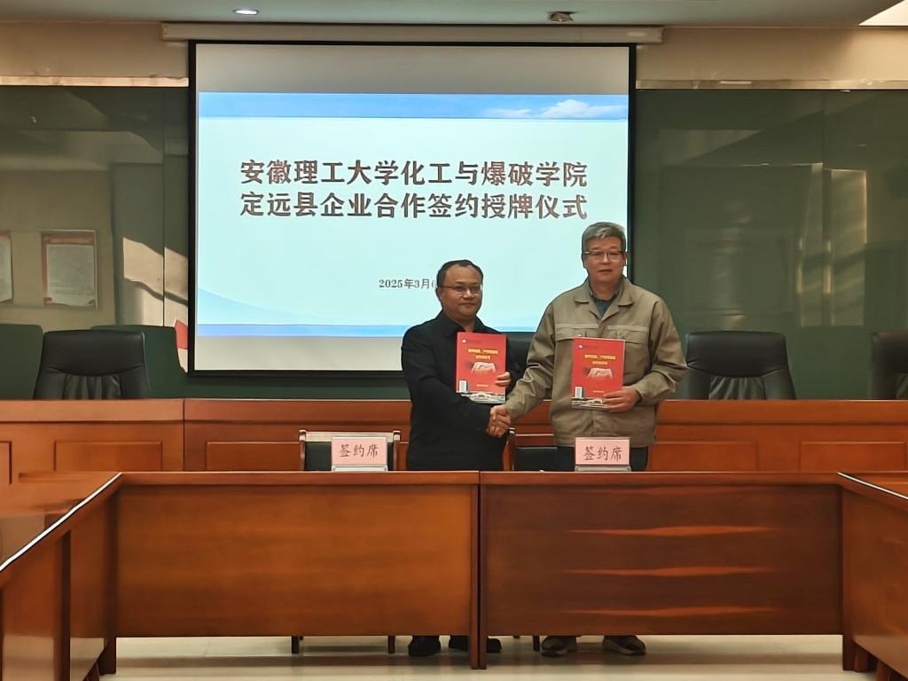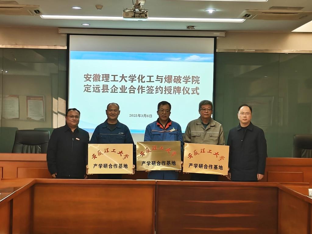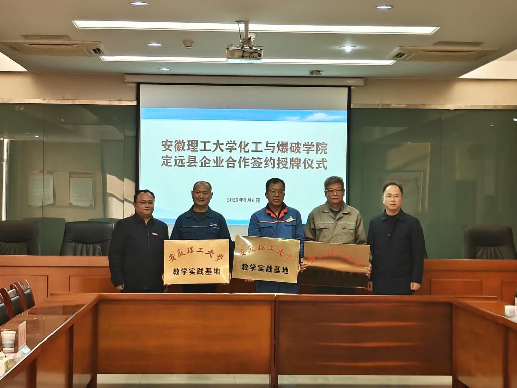 为落实化工与爆破学院与定远县政府战略合作协议相关工作,深化产学研教合作,3月6日下午,化工与爆破学院院长汪泉、学院化工专业负责人等一行赴定远县盐化工业园区与相关企业举行产学研合作基地、教学实践基地揭牌仪式。定远县委常委、组织部部长陶应付、县人社局局长宋德勇、县科技局局长董淑刚、县经济开发区管委会主任单正稳及相关部门人员,安徽华塑股份有限公司、安徽金轩科技有限公司、安徽泉盛化工有限公司等企业负责人出席交流活动。