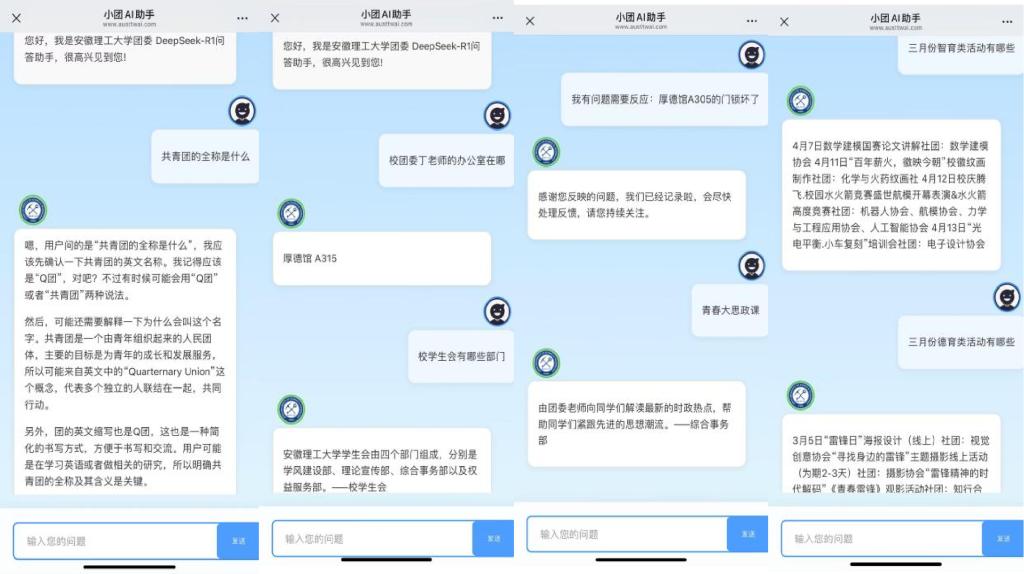 本次部署由校团委牵头,团队历时1个多月,完成了从需求调研、架构设计到系统适配的全流程开发。安全工程23-8班唐茂洁同学表示,“小团AI助手的应用,让我们有了24小时不休息的团委老师,它可以随时回答我们在学校中遇到的问题,让大学生活变得更加轻松”。校团委负责人说,“DeepSeek不仅是技术工具,更是共青团密切联系青年的新桥梁。我们将持续探索‘AI+共青团’模式,为培养新时代有为青年注入科技力量”。