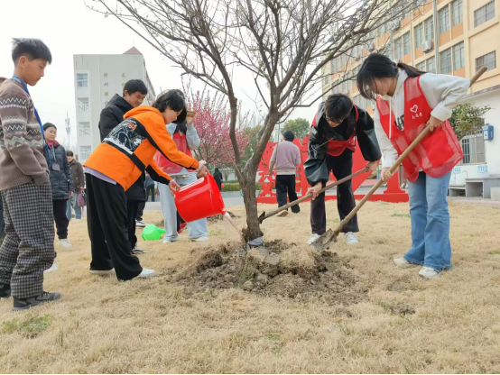 活动最后,志愿者与孩子们来到校园的空地上,一起参与植树活动。大家分工协作,有的填土、有的扶苗、有的浇水,现场一片热火朝天。在共同努力下,一棵棵树苗扎根泥土,迎着春风傲然挺立。孩子们看着亲手种下的树苗,眼中满是期待。这些树苗不仅为校园增添了一抹新绿,更寓意着希望与成长,象征着志愿者与孩子们共同种下的美好未来。
