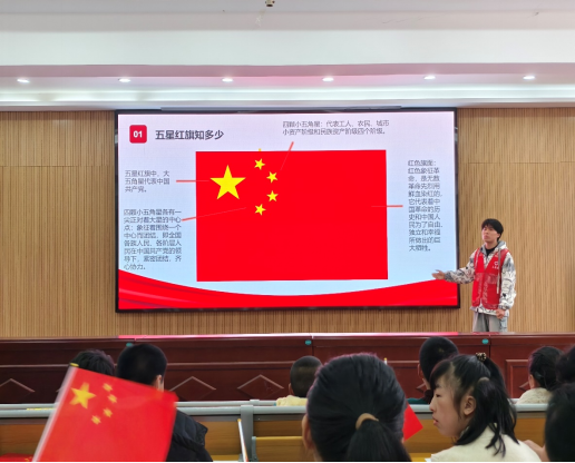 随后,志愿者们为孩子们带来了一场生动的爱国主义教育课。大学生志愿者通过图文并茂的展示、生动的讲解和互动,带领孩子们认识国旗、国徽和红领巾的象征意义。随后,孩子们拿起画笔,认真地描绘心中的国旗,鲜艳的色彩、稚嫩的笔触,饱含着对祖国的热爱。
