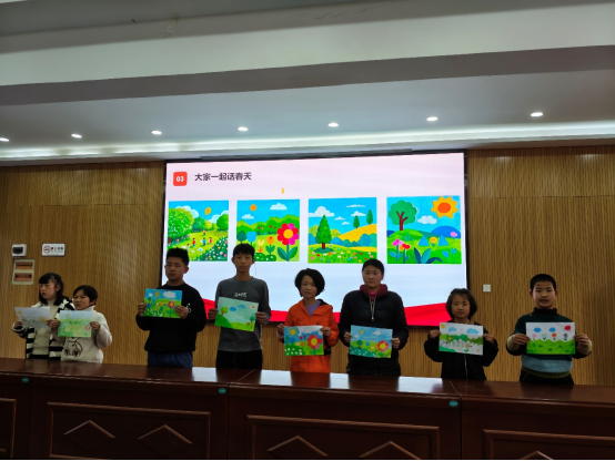 在“春天的色彩·我的梦想世界”绘画环节,志愿者与孩子们共同合作,完成了一幅幅春天的画卷。孩子们手握彩笔,在画布上尽情挥洒想象力:绚烂的花朵、嫩绿的草地、飞翔的小鸟、飞舞的蝴蝶……画卷色彩斑斓,承载着他们对美好生活的向往。绘画过程中,志愿者们耐心指导,与孩子们亲切交流,现场气氛温馨融洽。