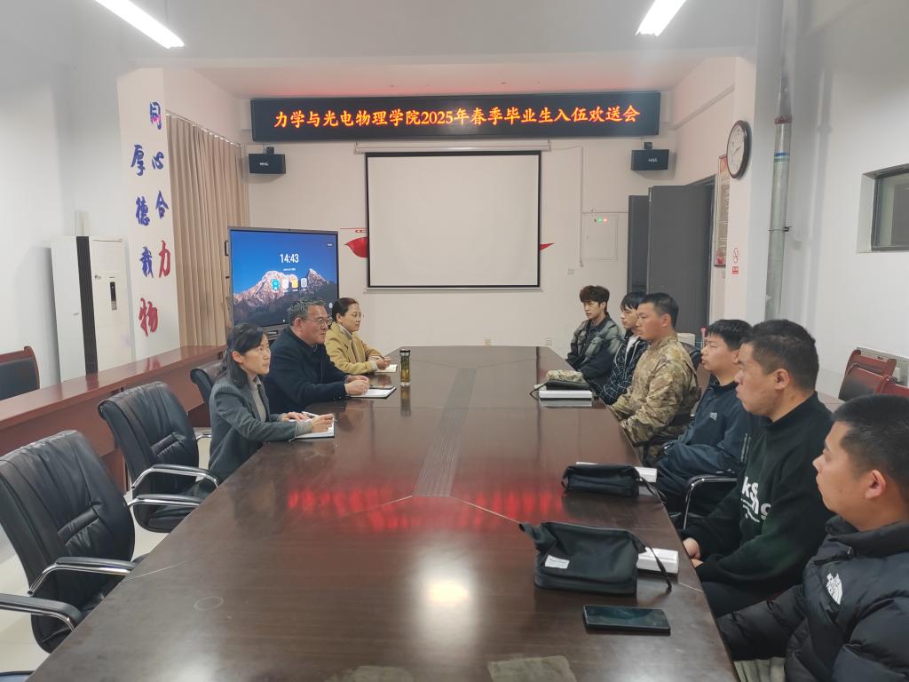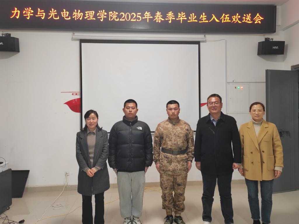 阳春三月送新兵,一身戎装踏征程。3月12日下午,力学与光电物理学院在明道楼A320报告厅举行2025年春季大学生入伍欢送会,欢送学院即将启程奔赴军营的2名准新兵应届毕业生。学院党委书记孙东升、常务副院长高娟、党委副书记郑孝莲、毕业班辅导员、有应征意向的毕业班学生参加活动。