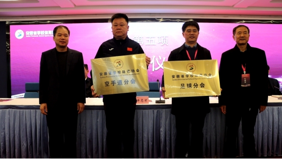 会议期间,安徽省教育厅体卫艺处分别对安徽省学校体育协会空手道分会和足球分会进行了授牌。我校作为安徽省学校体育协会空手道分会主席单位,汇报了空手道分会2024年工作和2025年工作计划。