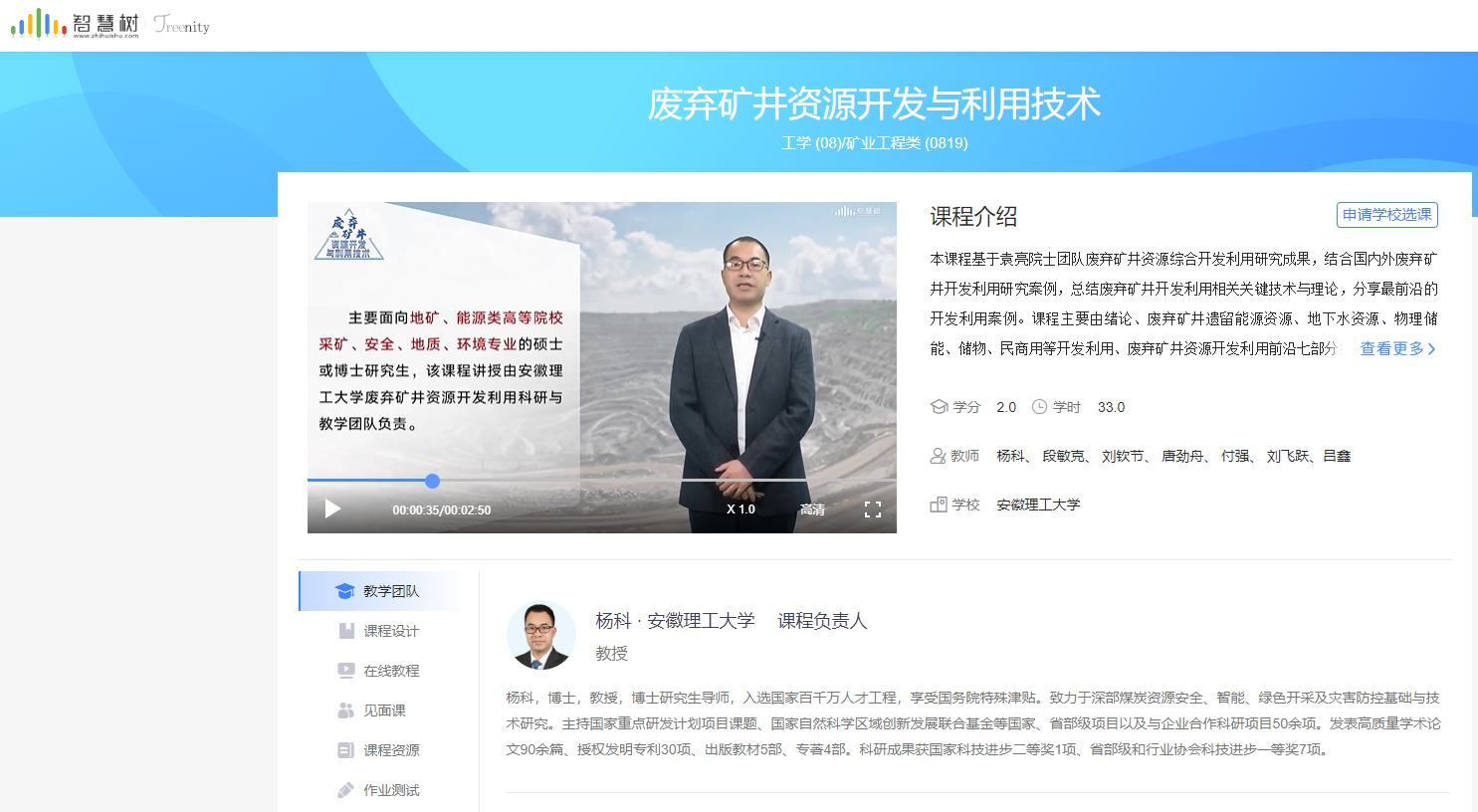 近日,矿业工程学院杨科教授负责的安徽省新时代育人质量工程项目(研究生教育)线上示范课程《废弃矿井资源开发与利用技术》在智慧树平台正式上线运行,该课程教学团队由矿业工程学院废弃矿井教研团队主要成员杨科、刘钦节、段敏克、刘飞跃、唐劲舟、付强、吕鑫等组成。