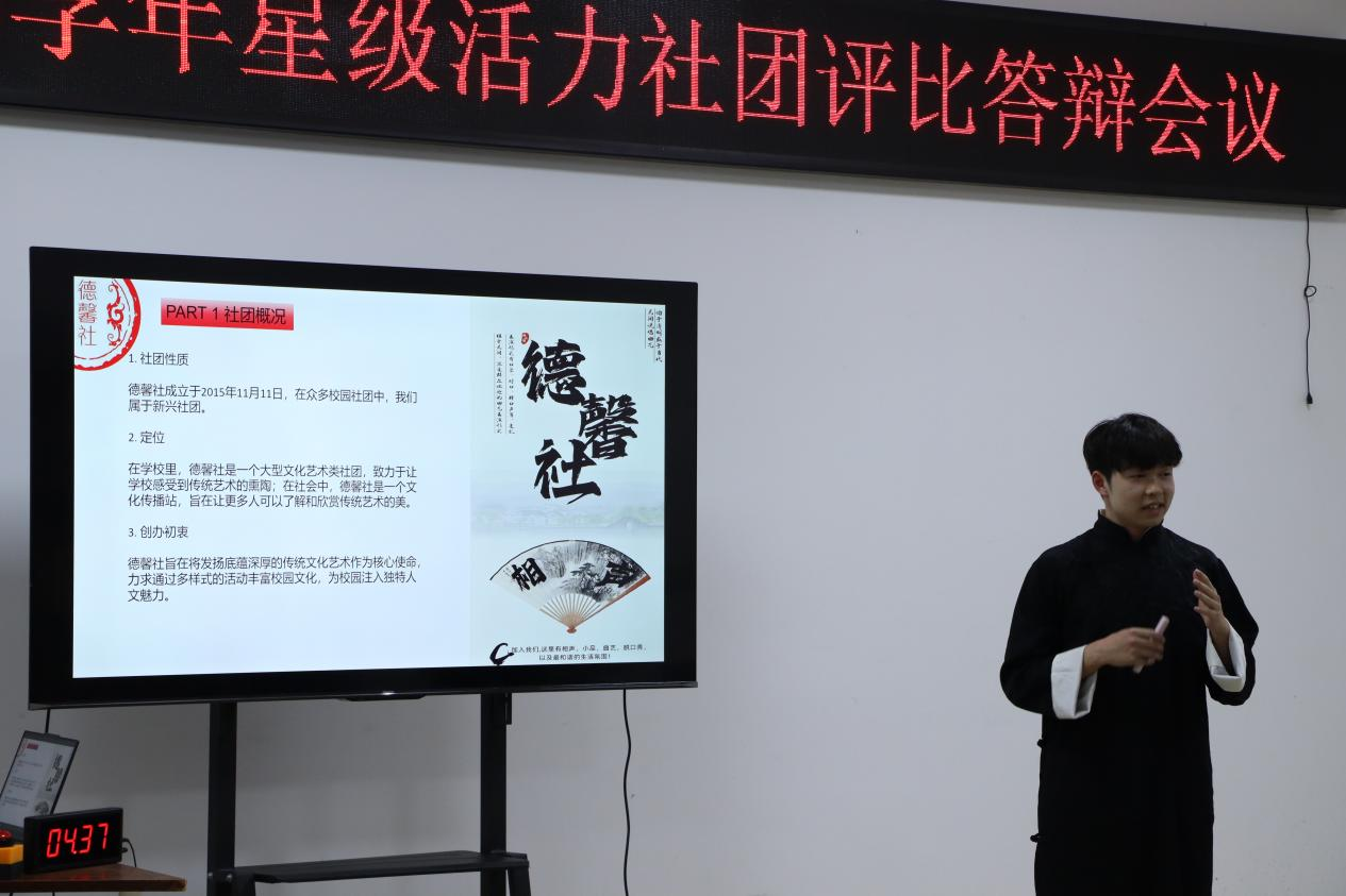 评比现场,各社团负责人围绕思想引领、组织建设、品牌活动、育人成效、未来规划等方面进行汇报。其中,习近平新时代中国特色社会主义思想研究会创新活动形式,将线上红色读书周活动拓展至线下,获得评委一致认可。机器人协会秉承“铁甲钢拳,勇往直前”的理念,汇聚全校机器人爱好者,通过高质量的社团活动有效激发同学们的创造力,成为社团的一大亮点。德馨社、素瑾汉服社将传统文化以年轻化、时尚化的方式呈现,通过“开箱晚会”“封箱晚会”“汉服出行日”等品牌活动,让文化自信在校园落地生根。