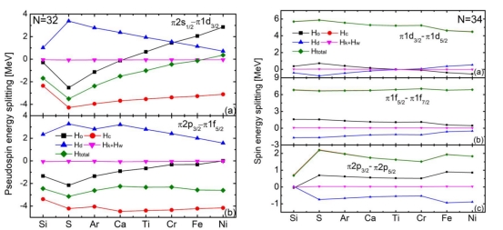 相对论对称性在核结构的演化中扮演着十分重要的角色,如何利用对称性恰当解释奇特结构,是核物理中最重要的研究领域之一。史新星与合作者利用相对论平均场的点耦合模型结合类重整化群方法,以核物理领域关注度极高的中等质量区,新幻数N=32、34同中子素链偶偶核为例,凭借相对论对称性的研究角度,清晰地展示了奇特核同位旋依赖效应及与相对论平均场的关系,进一步探寻了相对论对称性在壳层演化、气泡结构形成中所起到的重要作用。相关研究成果以《Exploring relativistic symmetry in shell evolution in the N=32 and N=34 isotones within a relativistic point-coupling model and the similarity renormalization group》为题发表:PHYSICAL REVIEWC 111, 034304(2025)。