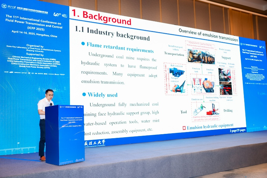 会上,何涛副教授应邀宣讲了题为《Study on lubrication characteristics of textured plunger pair of horizontal water hydraulic pump in coal mine》的学术报告。