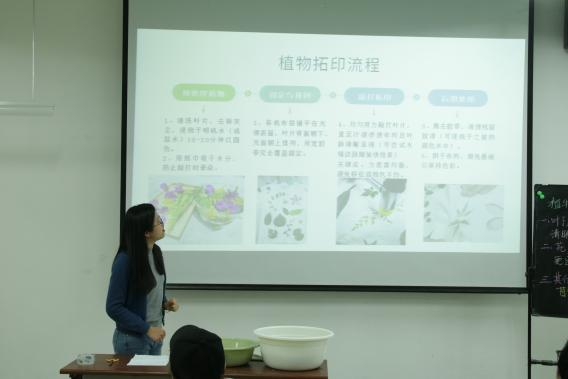 活动中,刘露老师向同学们介绍了植物拓印的历史渊源和基本原理,讲解了选叶、预处理、构图、敲打等关键步骤,并进行了精彩的示范。