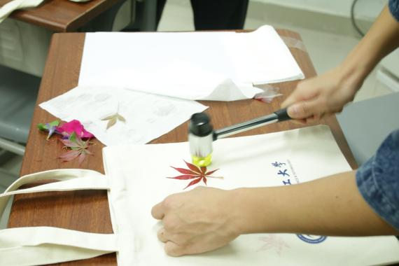 操作环节中,同学们将新鲜的植物叶片和花瓣铺放在白色的布袋上,用小锤子轻轻敲打,使植物的汁液渗透进布料,一时间“哒哒哒”声此起彼伏。同学们以锤作画,借素娟之布,载植物之身,全神贯注沉浸在创作的喜悦中,在拓染的过程中释放了压力,舒缓了情绪。