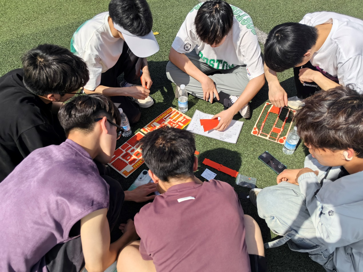本环节以团队竞技形式展开,每组队员在“河流”中交替放置三块砖形泡沫块完成“过河”任务,全部通过用时最短者获胜。“我们在失败中不断调整方法,最终成功‘过河’,这让我深刻理解了‘摸着石头过河’的智慧。”2024级机设专业学生汪同学分享道。