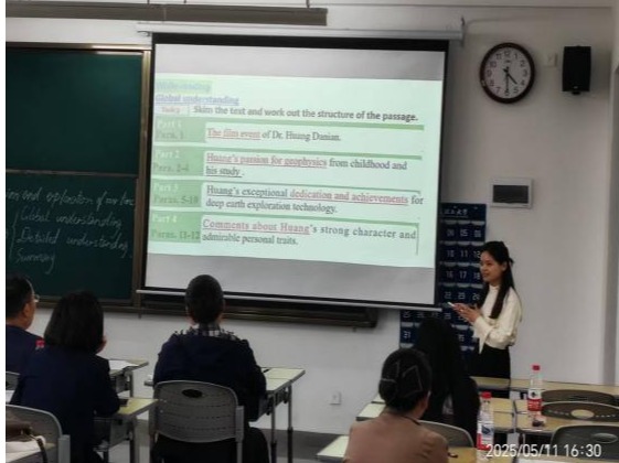 赛后,地球与环境学院的褚程程老师给予精彩点评。她充分肯定选手们教学热情与专业素养,同时建议参赛教师加强课堂节奏把控,避免内容过载;深化思政元素与语言教学的有机融合;优化板书设计与课件逻辑性,提升知识传递效率。