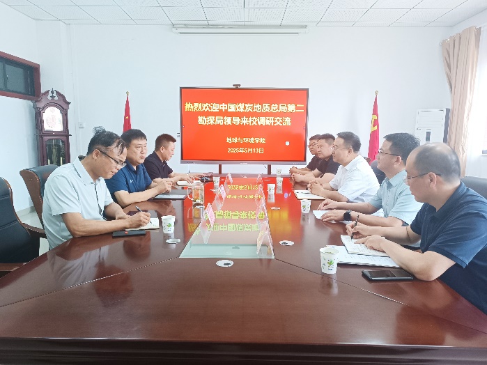 5月13日下午,中国煤炭地质总局第二勘探局党委委员、纪委书记左德松一行5人来地球与环境学院调研交流。座谈会由学院院长刘启蒙主持,副院长张世文、地质与勘查工程系吕玉广教授参加座谈会。