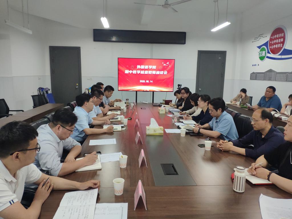 5月14日下午,外国语学院在崇智楼B203召开2024-2025学年第二学期期中教学检查教师座谈会。党委人才工作处、校团委、教务处、实验设备处、财务处、保卫处、总务部等相关职能部门领导参加座谈会。学院领导班子成员、系主任、教师代表等30余人参加了座谈会。
