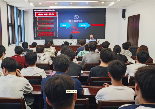 参观学习环节,学生在民警带领下走进刑事科学技术室,近距离了解指纹采集、痕迹检测等刑侦技术,观摩案件物证分析流程;随后前往反电诈工作室,学习实时预警系统运作机制,通过模拟诈骗电话、虚假网站案例解析,掌握识别诈骗话术的技巧。专题讲座环节,王远警官以《青春同心 反诈同行》为题,结合高校高发的“刷单返利”“游戏代充”“AI换脸诈骗”等典型案例,剖析诈骗手段的隐蔽性与危害性,并详细讲解“不轻信、不透露、不转账、多核实”的防范策略。