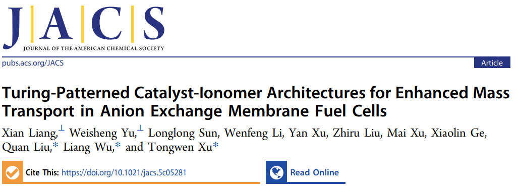 该研究成果以“Turing-Patterned Catalyst-Ionomer Architectures for Enhanced Mass Transport in Anion Exchange Membrane Fuel Cells”为题,近日发表于化学领域顶级期刊《美国化学会志》(Journal of the American Chemical Society)。由淮南师范学院/中科大博士后梁铣和中科大博士后余维胜担任共同第一作者,安徽理工大学刘泉副教授、中国科学技术大学吴亮教授和徐铜文教授共同担任通讯作者。