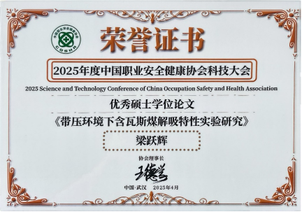 近日,中国职业安全健康协会正式公布2025年度优秀硕士学位论文评选结果,安全科学与工程学院安全科学与工程专业24级博士研究生梁跃辉凭借其硕士论文《带压环境下含瓦斯煤解吸特性实验研究》荣登榜单,成为本年度该领域最具创新性的研究成果之一。