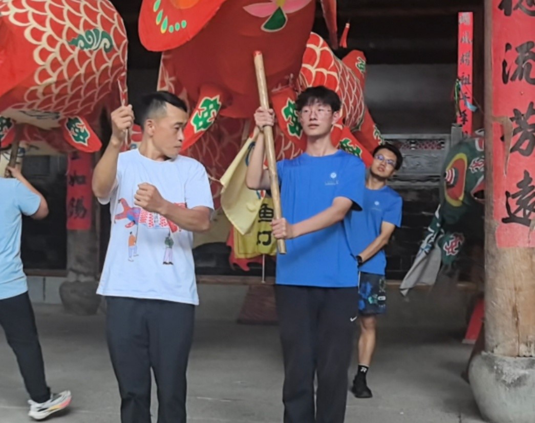郑东姣现场演绎了鱼灯经典“四戏”——“鲤鱼摆尾”(团圆)、“鱼腾千里”(不屈精神)、“如鱼得水”(自强不息)、“鱼跃龙门”(前程似锦)。配合铿锵的锣鼓节奏,翻腾的鱼灯生动诠释了非遗的生命力。团队成员通过零距离观察构造、聆听讲解、沉浸式观演与亲身体验,系统掌握了这项融合民俗信仰与工艺美学的非遗密码。