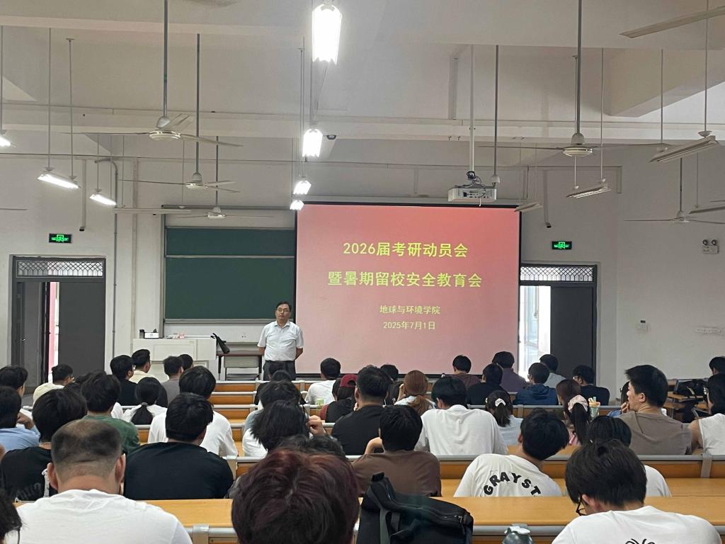 为做好毕业生就业和考研工作,帮助学生明确择业方向,有效保障暑期留校学生安全,7月1日下午,地球与环境学院在天工201教室召开2026届毕业生考研动员暨暑期留校安全教育会。学院党委副书记贾伟主持会议,2026届留校考研的200余名学生及带班辅导员参加会议。