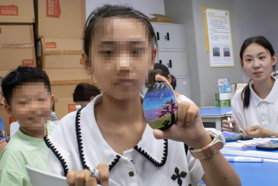 手工课上,大学生志愿者和孩子们一起制作漆扇、绘制石头画、制作手工爆米花。小艺术家们用自己灵巧的双手绘出了独属于自己的完美漆扇,爆出了“美味的爆米花”,创作了精致的石头画,每个人脸上洋溢着幸福的笑容。