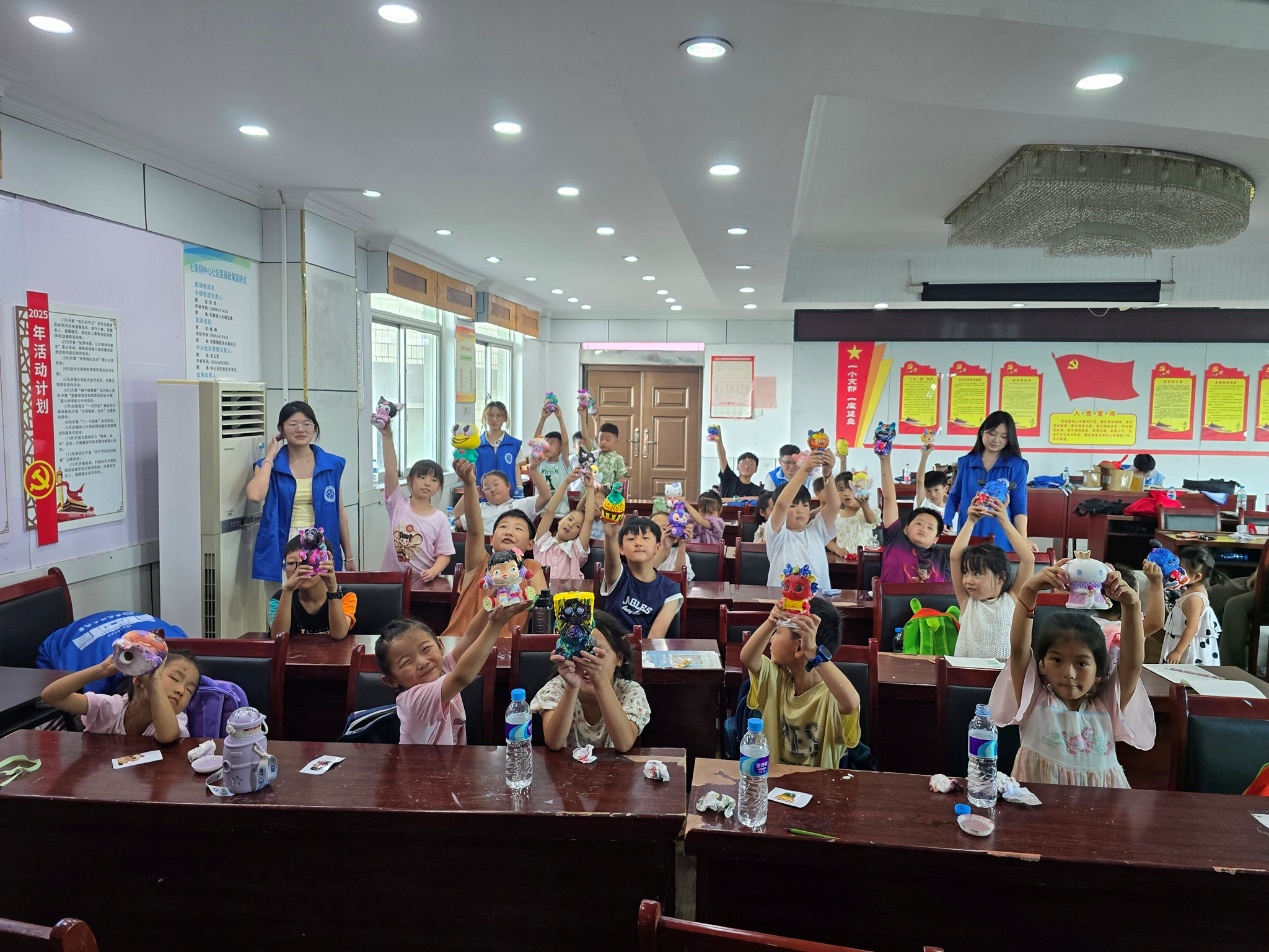 在创意美术课堂上,队员们悉心指导孩子们运用色彩与材料进行创作,鼓励他们充分发挥想象力。孩子们在实践中感受艺术魅力,创作的作品兼具童趣与创意,不仅提升了审美素养,更激发了创造潜能。正如队员所言:“美育不仅是技巧传授,更是引导孩子们用心灵感受美、用双手创造美的过程。”