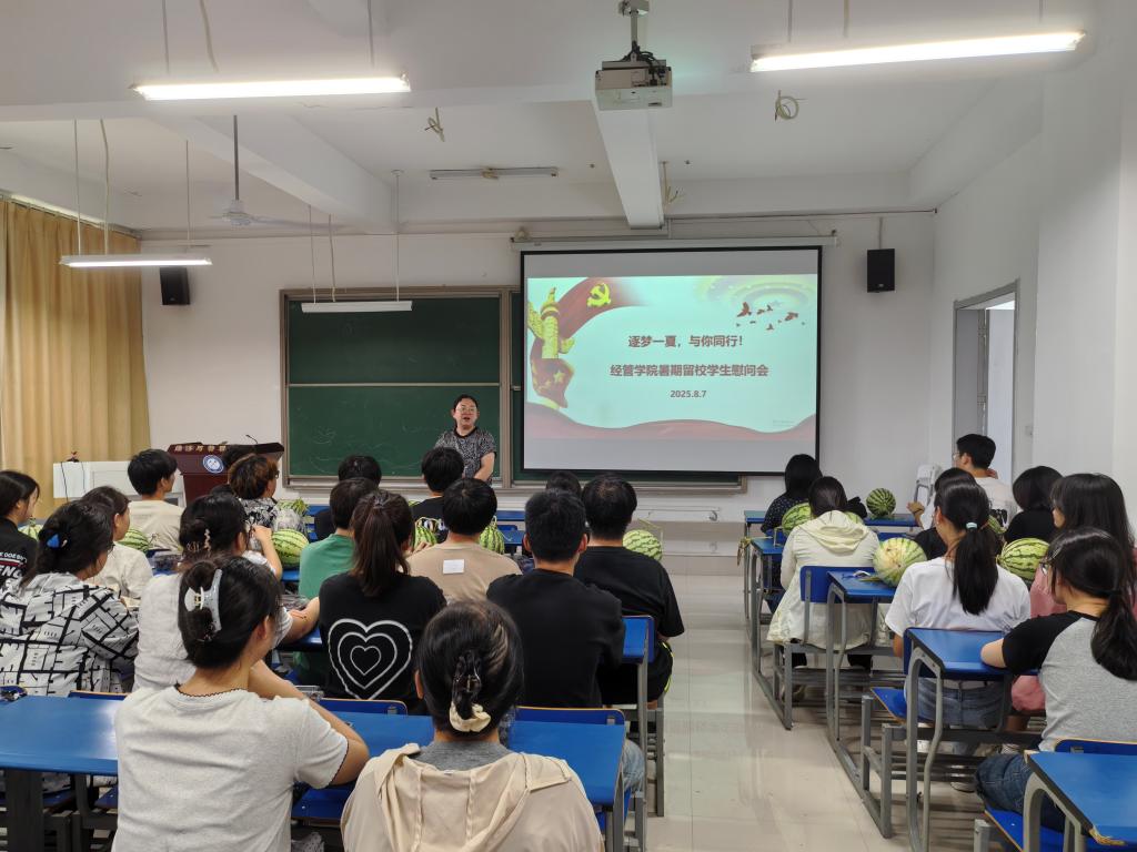 为切实关心暑期留校考研学生的学习生活,传递学院的温情与鼓励,8月13日下午,经济与管理学院在崇信楼东104教室举行慰问会。学院党委副书记胡珊珊、全体2026届毕业班辅导员为留校考研学生送上西瓜、葡萄等消暑水果,为学子们加油鼓劲。