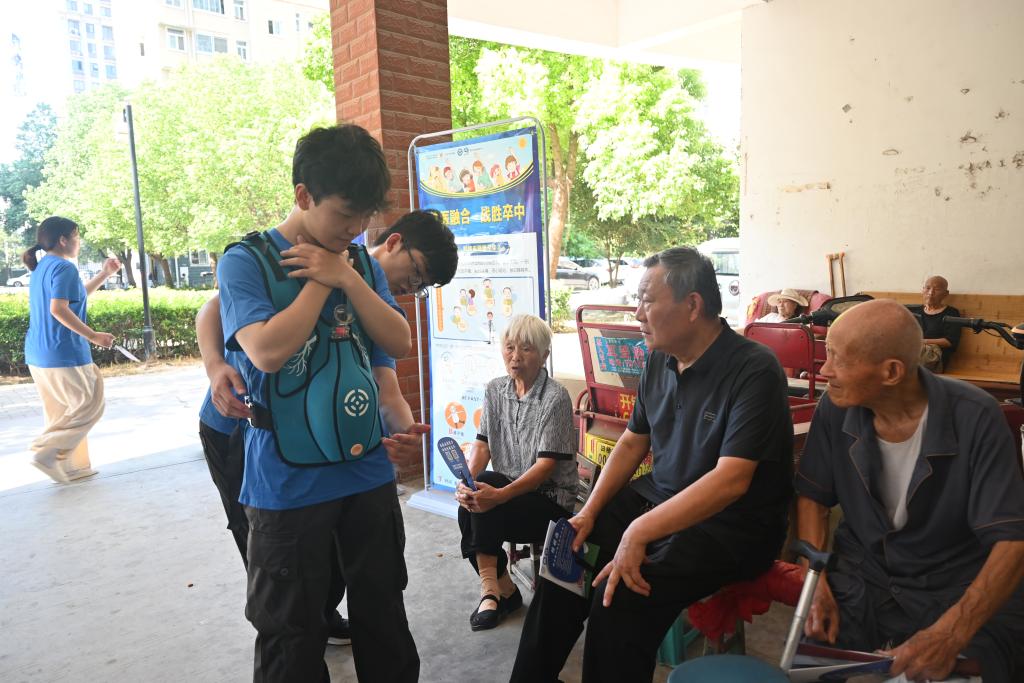 由医学院15名师生组成的“临床专家+大学生”健康关爱团队,在裕泉花园小区设置临时诊疗点,为社区居民提供健康咨询及身体检查,医生耐心地为居民问诊,解答问题并提供个性化健康指导。志愿者们为居民们进行血压和血糖测量,一边测量,一边向居民解释指标的意义和日常注意事项。