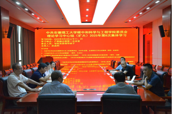 9月3日上午,碳中和科学与工程学院在产教融合楼一楼会议室召开2025年第8次党委理论学习中心组学习(扩大)会,会议由院党委书记武成利主持,学院党委领导班子全体成员等参加。
