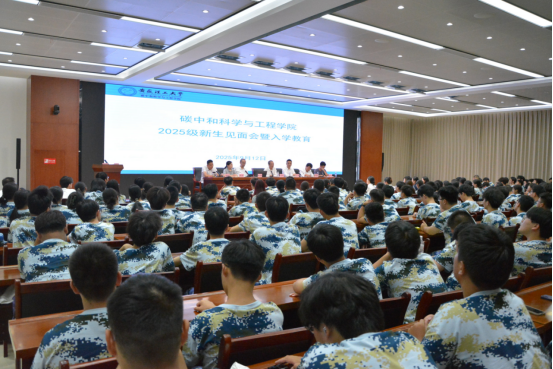 9月12日晚,碳中和科学与工程学院2025级新生见面会在念艰楼三楼报告厅举行。院长王会社,院党委副书记王鹏,副院长杨科、古晓锋,教师代表,新生辅导员及全体2025级新生共同参会,会议由王鹏主持。
