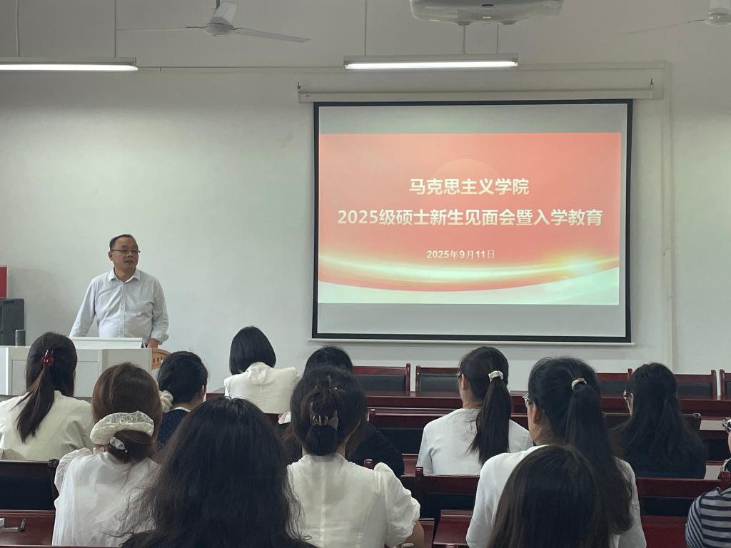 9月11日,马克思主义学院2025级新生欢迎会暨入学教育在崇智楼411会议室举行,学院领导班子、导师团队以及全体硕士生齐聚一堂。马克思主义学院院长发表欢迎辞,对新生们的到来表示最热烈的祝贺和最诚挚的欢迎。院长系统全面地介绍了学院的发展历程、学科特色、师资力量以及科研成果等方面的情况,让新生们对学院有了更深入的了解。同时,院长还逐一介绍了在场的研究生导师及其研究方向,为即将开展的“导师双选”工作搭建了良好的沟通桥梁。马克思主义学院党委副书记(主持工作)详细讲述了学校在人才培养、科学研究、硬件设施等方面的显著特色与突出优势。她鼓励新生们要心怀学校,以校为荣,在新的学习环境中追求卓越,努力成为有理想、有本领、有担当的新时代青年。分管副院长就入学教育安排、奖学金评选政策及《研究生手册》等重要内容作了详细解读,耐心解答同学们的疑问,助力大家尽快适应新环境、新要求。