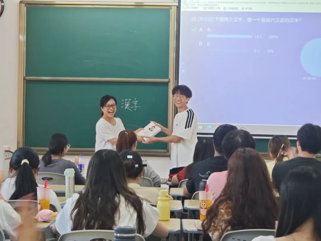 9月19日,明德楼111教室课后同样热闹非凡。日语专业同学在日语教师汪南雁的组织下,参与了一场紧张刺激的汉字知识竞答活动。汪老师强调,日语专业的学生在深入学习日语汉字的同时,绝不能忘记母语汉语汉字的规范书写,这是对本民族语言文化的尊重与传承。在竞答中,同学们积极思考、热烈讨论,将平日里积累的汉字知识尽情展现,既巩固了专业知识,又提升了对汉语汉字的理解与运用能力。