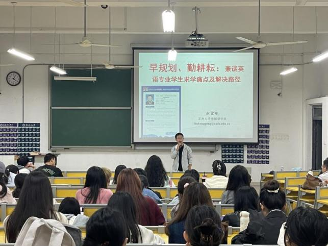9月25日下午,应科研部和外国语学院邀请,苏州大学刘宏刚教授在明理北112教室做题为“早规划、勤耕耘:兼谈英语专业学生求学痛点及解决路径”的学术讲座,学院师生共计150余人参加,讲座由外国语学院副院长周宁主持。
