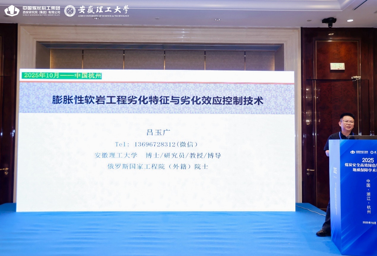 地球与环境学院院长刘启蒙、副院长吴海波一行5人参加会议。会议期间,刘启蒙受邀担任“水文地质与物探技术”分论坛主持人。吕玉广教授聚焦行业关键技术难题,以“基于水诱因的膨胀性软岩劣化效应与控制技术”为题作分论坛报告。其报告内容紧密结合工程实践需求,提出的技术思路与解决方案获得了与会专家学者的广泛关注与高度认可。