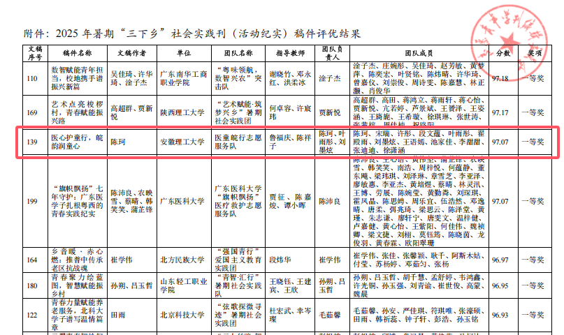 近日,《志愿青年学刊》编辑部2025年暑期“三下乡”社会实践专刊稿件征集评选活动结果公布,医学院“医童皖行志愿服务队”撰写的实践纪实文章《医心护童行,皖韵润童心》凭借扎实的内容与真挚的叙事,在众多投稿中脱颖而出,荣获一等奖,位列第三,两位指导老师鲁福庆和陈祥子荣获“优秀指导教师”称号。
